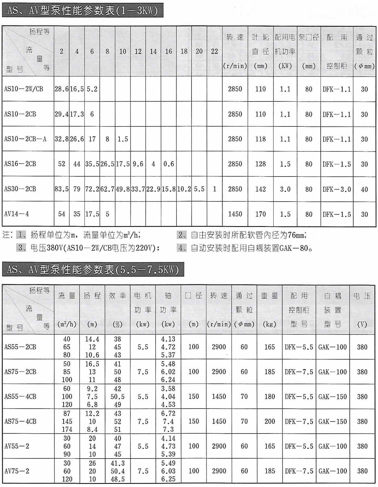 AS带自动切割潜水排污泵性能参数:
