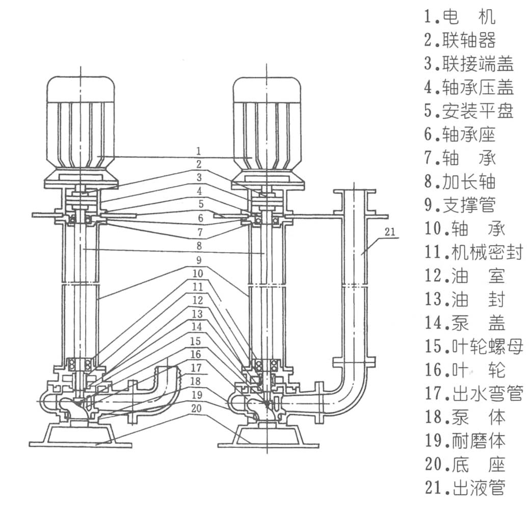 4、泵为立式结构,工作时泵体浸在液体中因而很容易起动,不存在排气抽空问题,液下深度可达3米。